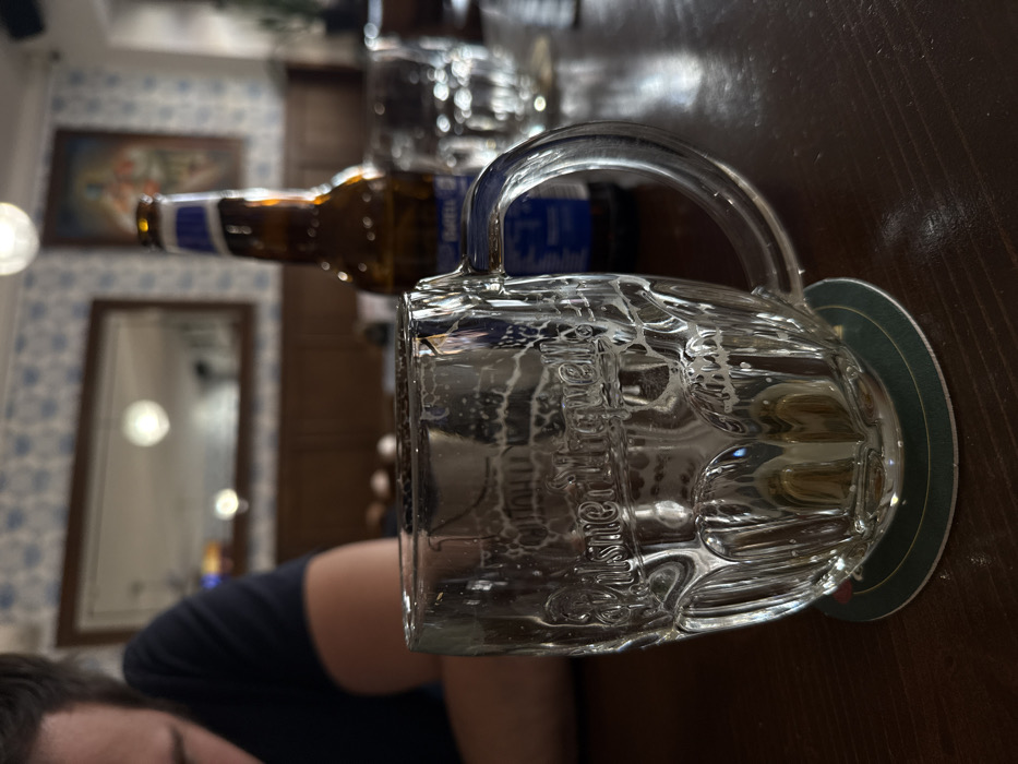 The image presents an indoor scene within an establishment in Stupava, Slovakia, viewed from a low perspective. In the foreground, a clear glass beer mug, branded "Pilsner Urquell" in embossed lettering, sits on a circular green and white coaster. The mug is predominantly empty, exhibiting residual foam patterns (lacing) on its interior walls and a small amount of liquid at the bottom. Directly behind the mug, a brown glass beer bottle with a blue and white label stands upright, partially out of focus. To the right of the bottle, another empty, clear glass with a textured surface is visible. The foreground objects rest on a dark wooden table surface. In the blurred background to the left, a person's head and shoulder, wearing a dark garment, are partially visible. The wall behind the table features a blue and white patterned wallpaper above dark wooden paneling. A rectangular mirror with a dark frame reflects interior lighting fixtures. To the right of the mirror, a framed picture or painting, depicting a figure with a halo, hangs on the wall.