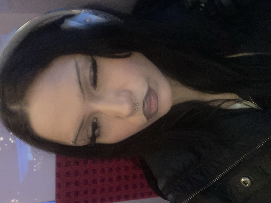 The scene takes place within a public transport vehicle, such as a train or bus, potentially located in or traveling through Enghien-les-Bains, France. The image presents a medium-close-up of a female individual, positioned slightly off-center to the viewer's right. She has long, dark, straight hair, center-parted, and wears light-colored over-ear headphones. Her right eye (viewer's left) is closed in a distinct wink, while her left eye (viewer's right) is open and gazing downwards. Her eyebrows are thin and sharply arched, with a multi-sphered curved bar piercing above her left eyebrow. Dark, winged eyeliner is applied to both eyes, complemented by long eyelashes. A silver-toned horseshoe barbell piercing is visible in her septum. Her lips are pursed, covered with a dark reddish-brown lipstick. She wears a black padded jacket with a visible zipper closure, and a white garment beneath it. The background is blurred, showing dark red, textured fabric consistent with seating upholstery on the left, and lighter-toned surfaces with indistinct bright points of light above it, indicative of an interior cabin environment.
