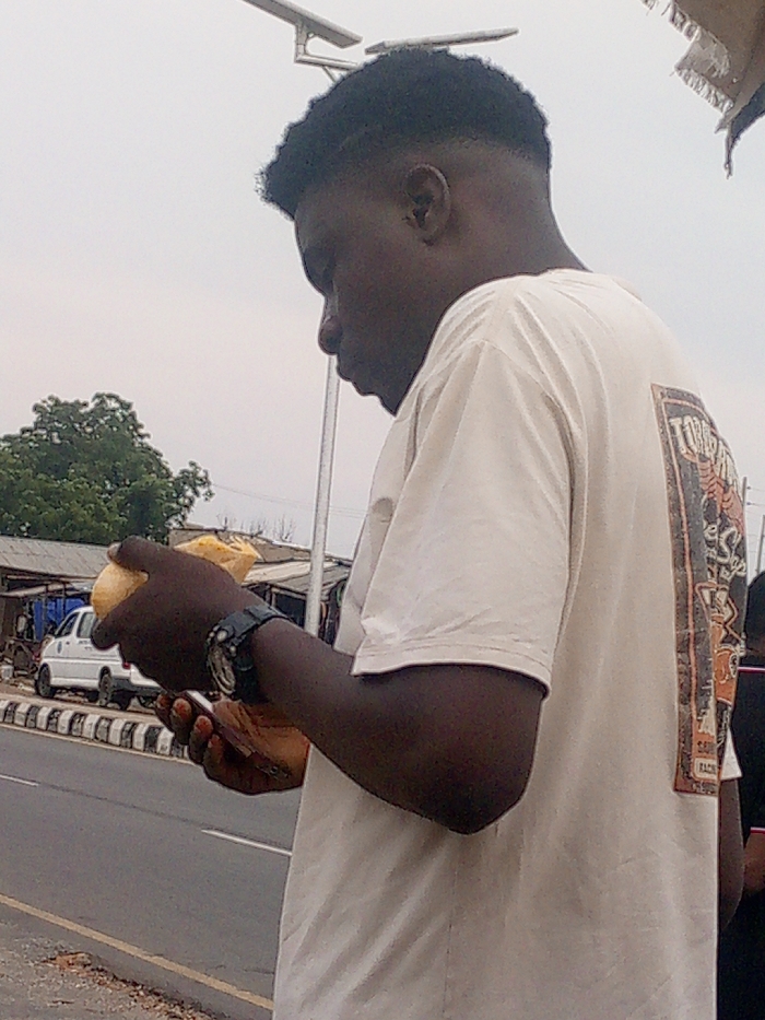 An individual, identified as a dark-skinned male, is observed from a mid-torso perspective, standing on the edge of a road in Zango-ndaji, Nigeria