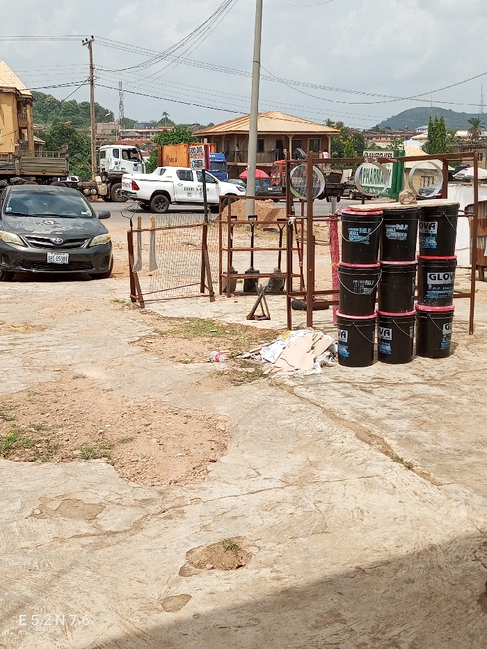 The scene is a street corner in Ado Ekiti, Nigeria, with a mix of residential and commercial buildings. There is a black car parked in the foreground, a white pickup truck parked farther back, and a blue truck in the background. The car has a license plate that reads "BGC 451 JBT". The pickup truck appears to have the word "Glory" written on it. There are a few blue and black buckets stacked on top of each other, in front of a metal frame structure, with writing on them. There are also several bags and other objects scattered on the ground. The ground is a mix of cracked concrete and dirt. The sky is overcast and a few trees are visible in the background.