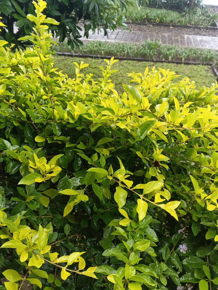 The image displays a close-up view of vibrant foliage within Stueng Saen, Cambodia. The immediate foreground is filled with a dense bush characterized by numerous leaves in varying shades of green, with newer or illuminated leaves exhibiting a distinct yellow-green color. Water droplets are visible on the surface of many leaves. A single, small, pale purple flower is observable among the lower leaves towards the right side of the bush. In the midground, a landscaped area features several horizontal layers of manicured green grass strips interspersed with narrow, light-colored paved pathways. The background contains blurred, denser green foliage from larger trees or shrubs. No people, animals, or specific actions are depicted. The scene is illuminated by natural daylight.
