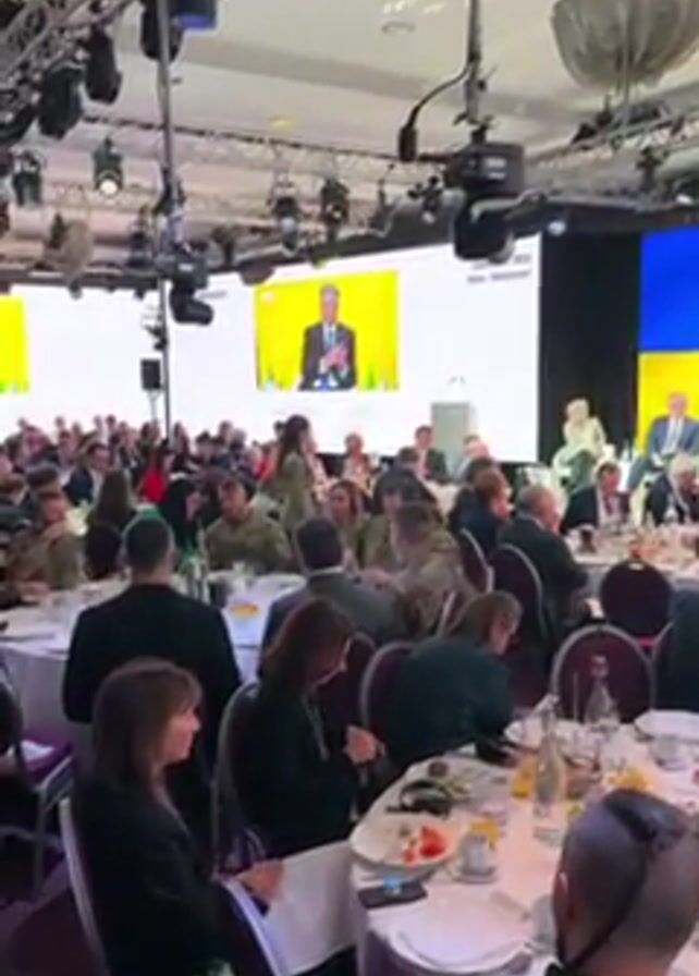large, crowded room filled with people seated at round tables. The room appears to be a ballroom or conference hall, indicated by the presence of a large screen displaying “UKRAINIAN BREAKFAST, January 22, 2026, Davos, Switzerland” along with the Ukrainian flag. Several people are sitting at a table on stage in front of the screen. Most of the seated people are formally dressed. There are military personnel in uniform among the audience. Many tables have plates with food, glasses and bottles on them. Lighting is provided by overhead track lighting and a large chandelier. People are sitting, standing and walking around. A woman wearing a long dress is talking on her phone. The focus of the room seems to be the stage.