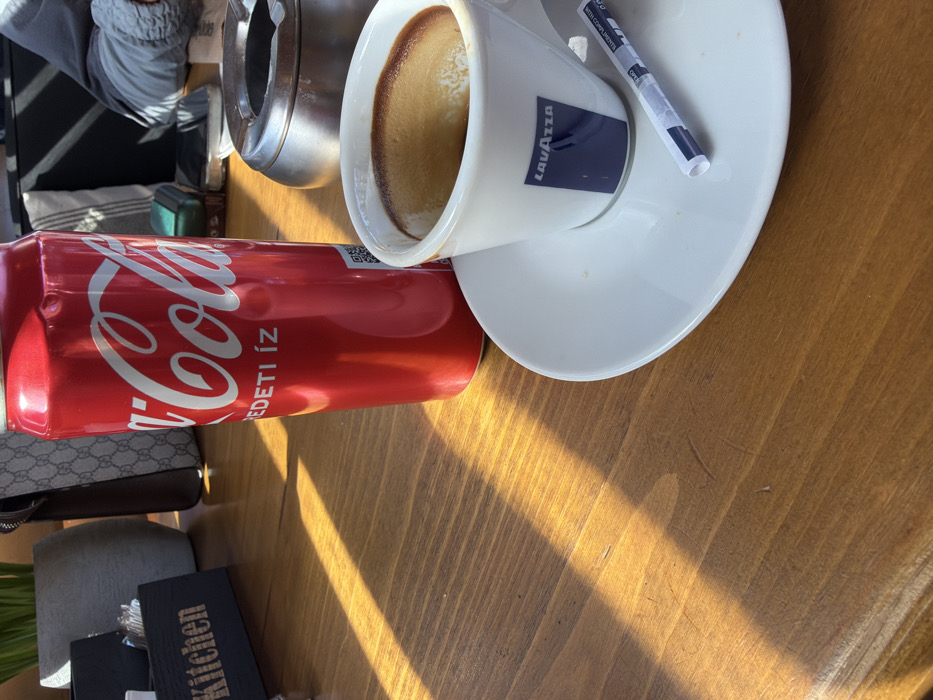 The scene depicts a tabletop view within a cafe or restaurant in Pleven, Bulgaria. A red Coca-Cola can, bearing "ERDETI ÍZ" (Original Taste in Hungarian) text, stands prominently near the center, slightly left. To its right, a white Lavazza espresso cup, containing a dark beverage with a light brown crema, rests on a matching white saucer. A small, rolled white paper packet, likely sugar, lies on the saucer. Behind the cup, a circular stainless steel ashtray is visible. The foreground is a light brown wooden table, streaked with distinct parallel bands of direct sunlight. In the blurred background on the left, a dark rectangular sign with "Kitchen" in light lettering is present, positioned in front of a grey planter containing green leafy plants. Further back, a tan and brown patterned bag, possibly a handbag, is visible on a surface. On the right side of the background, a person's left arm, clad in a grey long-sleeved garment, is partially visible, with other indistinct objects including what appears to be a mobile phone and another small accessory on the table surface. Strong natural light illuminates the scene, casting defined shadows.