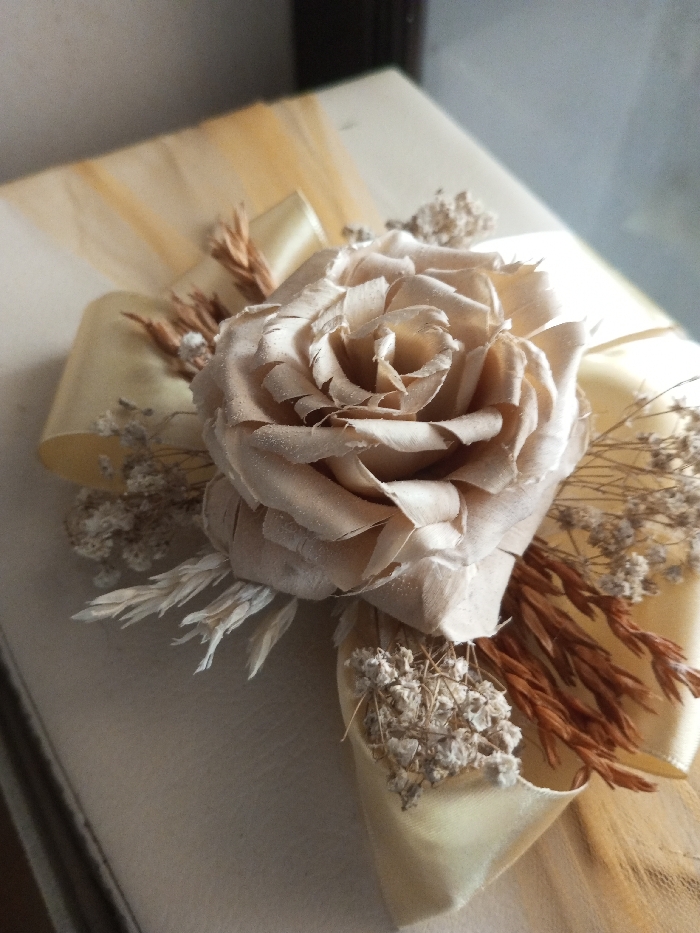 A close-up, high-angle shot presents a decorative arrangement situated on a light-colored, textured surface in Qarabucaq qəsəbə, Azerbaijan. The central feature is a large, light beige or pale pinkish-brown faux or dried rose, composed of numerous layered petals. This rose is surrounded and supported by a light yellow satin ribbon, forming a bow with visible folds. Interspersed among the ribbon and rose are various dried botanical elements: small clusters of tiny white-cream flowers, several bundles of slender, reddish-brown dried plant stalks resembling grains or grasses, and lighter, feathery dried plant material. The background is out of focus, displaying indistinct light and dark areas. No individuals, actions, or interactions are visible.