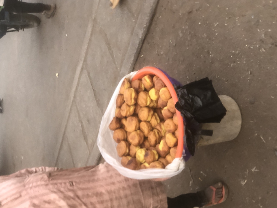 The image displays an outdoor street vending scene in Kufena, Nigeria. In the foreground, a large, round orange plastic basin holds a considerable quantity of small, golden-brown, fried food items, possibly fritters or puffed snacks. These items appear uniform in size, with some exhibiting lighter yellowish sections. The basin is lined with a translucent plastic bag and rests on an overturned, light-colored cylindrical bucket or stool. A crumpled black plastic bag is tied or draped around the base of this support. To the immediate left, the lower torso and legs of an individual are visible. This person wears a light peach-colored, vertically striped long-sleeved garment, dark trousers, and a red and black flip-flop sandal on their left foot. In the mid-ground right, the lower legs and feet of another person are visible, wearing dark trousers and light-colored footwear, standing near a dark wheel that suggests a bicycle or pushcart. The ground surface is a mix of light gray concrete paving slabs and darker, rougher asphalt or dirt with scattered particulate matter. The scene is illuminated by ambient daylight.
