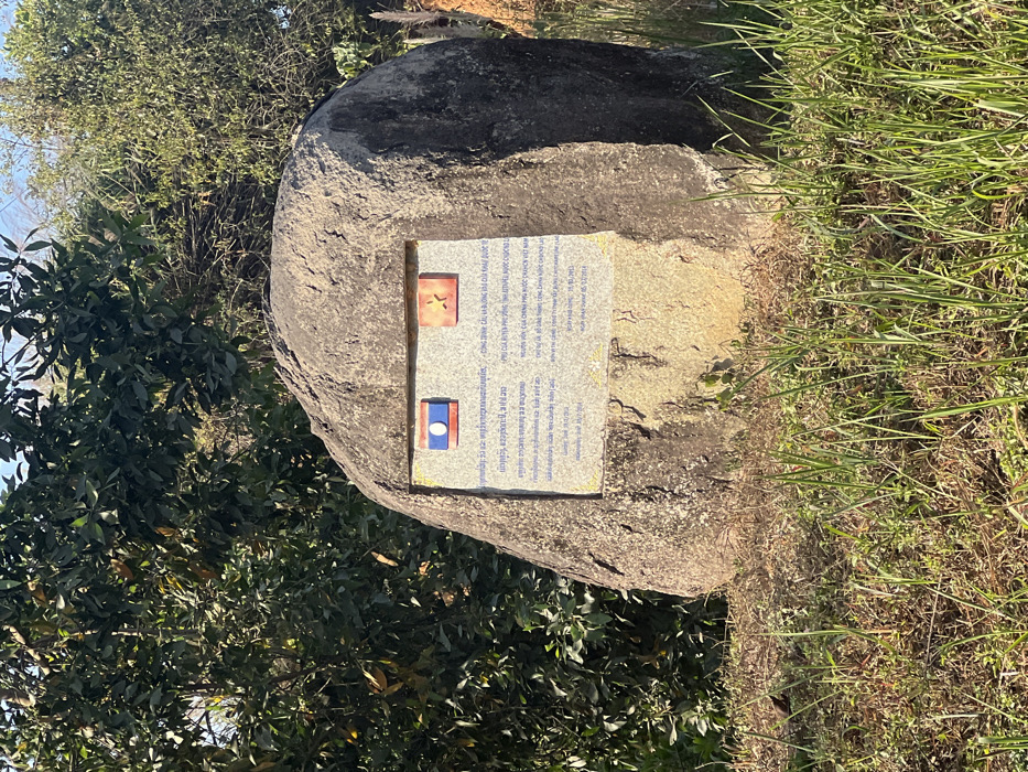 A large gray rock sits amidst greenery. Affixed to the rock is a plaque featuring two flags above printed text. The upper flag has a red background with a yellow symbol. The lower flag displays horizontal red stripes separated by a blue stripe, with a white circle in the center. Dense foliage surrounds the rock on the left, while tall grass grows on the right.