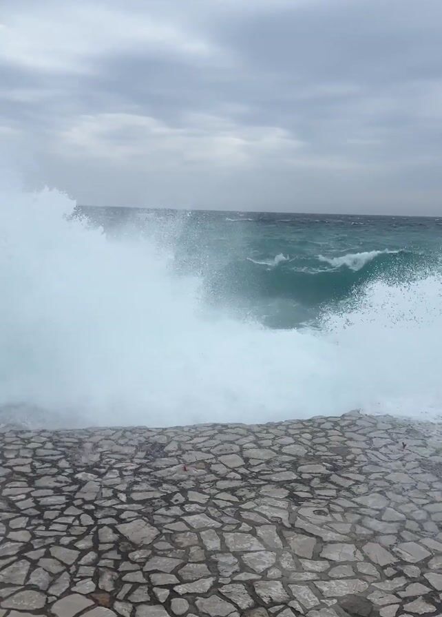 The video displays rough seas against a rocky coastline under a cloudy sky. The camera is positioned on a stone-paved surface and remains static throughout. Initially, the camera focuses on a massive wave crashing against the pavement. A startled cry can be heard as the wave disperses. The camera then pulls back to reveal a wider view of the ocean, showing numerous waves crashing against the shore and rocks. The sea is a turbulent mix of teal and white, and the sky is covered with dark, heavy clouds, indicating a stormy atmosphere. Birds are visible in the sky.