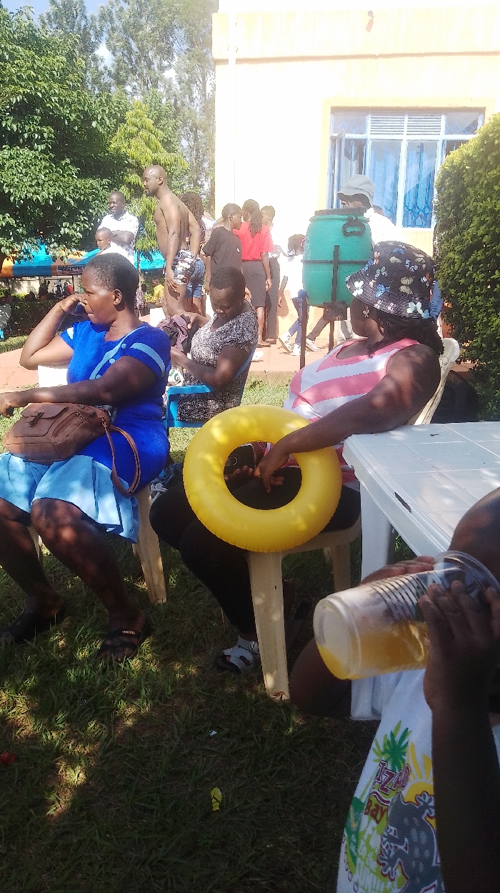The image depicts an outdoor social gathering in Siaya Township ward, Kenya