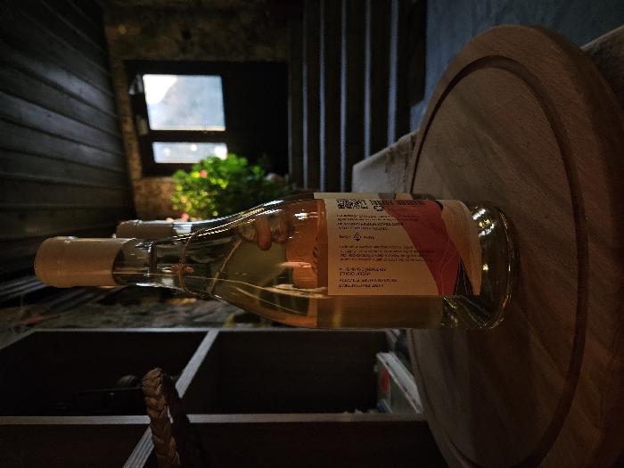 The image displays a dimly lit interior of what appears to be a traditional establishment or wine cellar in Melnik, Bulgaria. The central subject is a clear glass bottle, presumed to contain wine, filled with a translucent, light-amber liquid. This bottle stands upright on a round, light-colored wooden serving board with a grooved edge. The bottle's neck is sealed with a beige wax cap, and a small, light-colored, possibly wooden charm hangs from a thin string tied around the neck. A rectangular label with text and an abstract design featuring red, orange, brown, and blue geometric shapes is affixed to the bottle. Behind the primary bottle, a second similar bottle is partially visible and slightly out of focus. The immediate background to the right consists of a dark stone wall with visible mortar. To the left, a dark wooden shelving unit with a braided rope detail on its edge is partially visible. The ceiling is constructed from dark wooden planks. In the far background, a dark wooden door with two clear glass panes is centered, revealing a bright, outdoor, possibly mountainous or hilly landscape under daylight. A series of dark steps lead up to this door. A potted green plant with some pink or red flowering elements is situated to the right of the door. No individuals are present in the scene. The overall lighting is subdued, with ambient light entering primarily through the distant doorway.