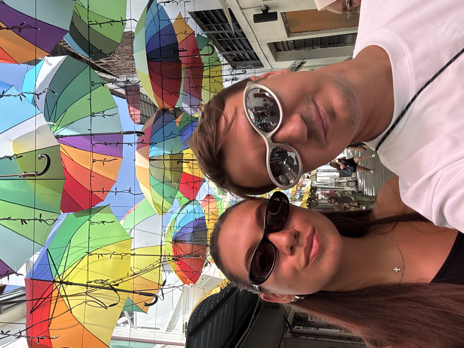 A selfie shows a man and woman wearing sunglasses. The man is on top wearing a white t-shirt and silver sunglasses. The woman is on the bottom wearing a black tank top and black sunglasses. Behind them, colorful umbrellas hang suspended in rows. In the reflection of the man's glasses, people are walking down a street with shops. The photo is rotated sideways.