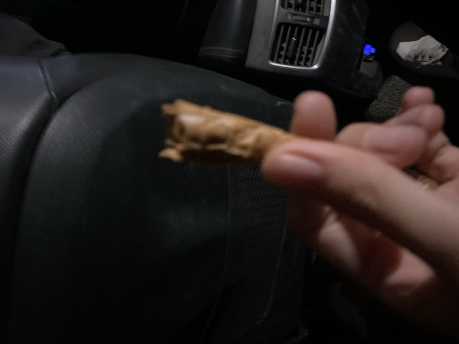 - "A hand holds a light brown, cigar-shaped object, possibly a treat or snack, in a car" by FM-U9GOy1, licensed under CC BY 4.0