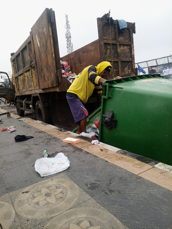 A man in a yellow hoodie and blue shorts stands beside a tipped-over green dumpster and an open-back garbage truck. He appears to be looking into the dumpster. Trash is scattered on the gray tiled sidewalk, including cans, a white bag, and other debris. The garbage truck is old and rusty, filled with more trash. A tall cell tower is visible in the background. A banner or sign hangs in the distance.
