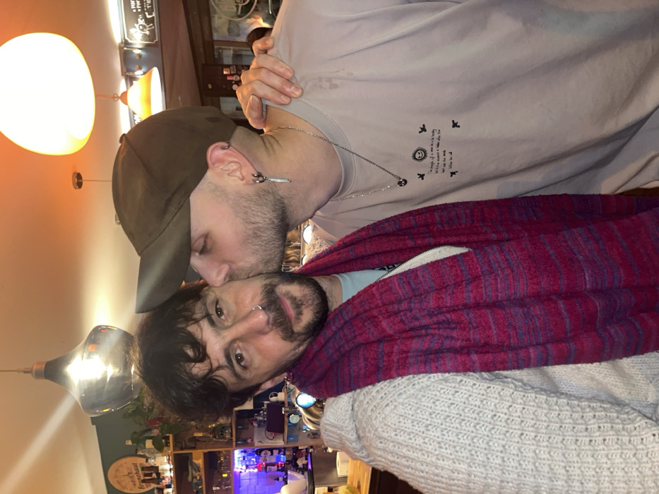 Two men are shown indoors near a bar. The man on top wears a brown baseball cap, a light purple shirt, and a silver necklace. He's kissing the other man on the forehead. The second man has dark hair and a mustache, wears a nose ring, and is wrapped in a pink and purple scarf and a gray sweater. Lights are visible above them. Shelves behind the men hold various bottles.