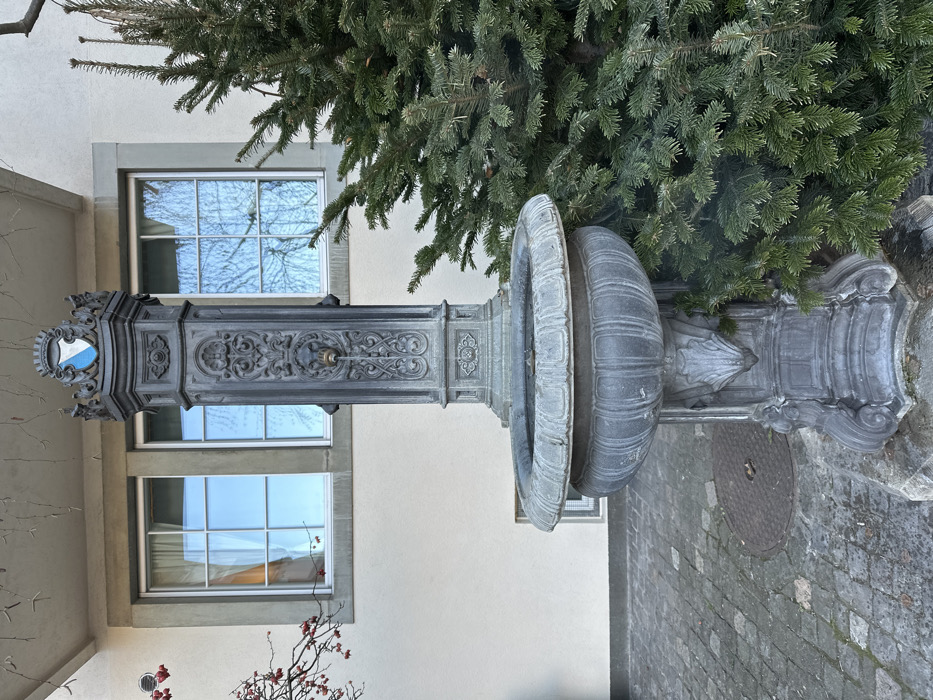 The image presents a prominent, ornate, dark grey cast-iron public fountain in an urban environment. The fountain consists of a tall, vertical pillar adorned with intricate scrollwork and decorative patterns. Water steadily flows from a lion's head spout into a wide, shallow, circular basin, which then drains into a larger, fluted bowl positioned below. At the apex of the fountain structure, a small, crowned shield displays the diagonally divided blue and white coat of arms of the City of Zurich. The fountain is situated on a paved surface of irregular cobblestones, with a circular metal manhole cover visible to the left foreground of its base. Directly behind the fountain stands a cream-colored building featuring two large, multi-paned windows. These windows reflect a bright sky and the skeletal outlines of bare deciduous tree branches. To the immediate right of the fountain, a dense, dark green evergreen tree, likely a spruce or fir, grows vertically. On the left edge of the frame, bare branches bearing small red berries are partially visible. The scene is illuminated by ambient daylight, indicating no direct harsh sunlight. No individuals are present, and no actions or interactions are depicted. This specific Löwenkopfbrunnen (lion head fountain) is located at Obere Zäune 27, in the Niederdorf district of Zurich, Switzerland.