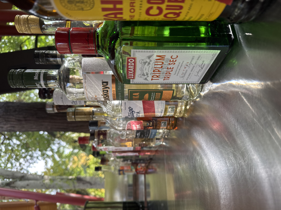 - "The image displays a ground-level, slightly upward-angled view of a bar counter featuring approximately fifteen to twenty liquor bottles arranged in a single row on a reflective, scratched metal surface" by FM-5N7nT2, licensed under CC BY 4.0