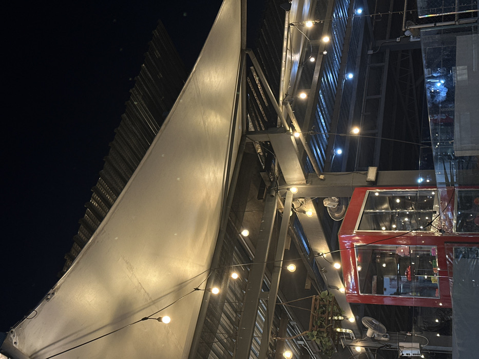 The image displays an illuminated outdoor or semi-outdoor commercial establishment at night in Tocuyito, Venezuela. A large, light-colored fabric canopy spans the upper portion of the frame, angled from the top-left towards the center-right. Above the canopy, a darker corrugated metal roof structure is partially visible against a dark, clear night sky. Below the canopy, a network of dark metallic beams and girders forms the structural framework. Numerous strings of spherical light bulbs are suspended from this framework and beneath the canopy, providing ambient illumination. Some bulbs emit a warm white light, while others appear cooler and more bluish. In the lower-left and central foreground, a freestanding, reflective red kiosk or display cabinet is prominent. It features multiple glass panels and metallic trim, with indistinct items visible inside its compartments. A white oscillating fan is mounted on a support structure to the left of the red kiosk, and another similar fan is positioned higher and to its right. A wooden hanging planter containing green foliage is suspended from the overhead structure near the left fan. Further to the right of the red kiosk, a rectangular white light fixture is affixed to a vertical support beam. In the lower-right quadrant, transparent glass barriers or railings are visible, reflecting the surrounding lights. No individuals are present in the scene.