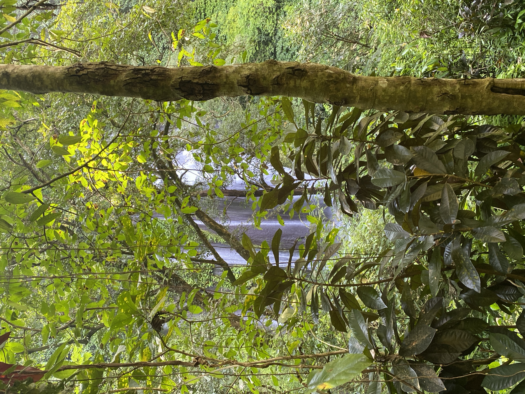 The image depicts a view of a waterfall, likely in Bengkel, Indonesia, as specified. The foreground consists of lush vegetation, including trees, branches, and various types of foliage. A thick tree branch runs horizontally across the middle of the frame, partially obscuring the view. Beyond the vegetation, a waterfall can be seen cascading down a rocky surface. The surrounding environment appears to be a dense forest. The lighting is natural, and the overall scene suggests a tranquil, natural setting. No people are visible in the image.