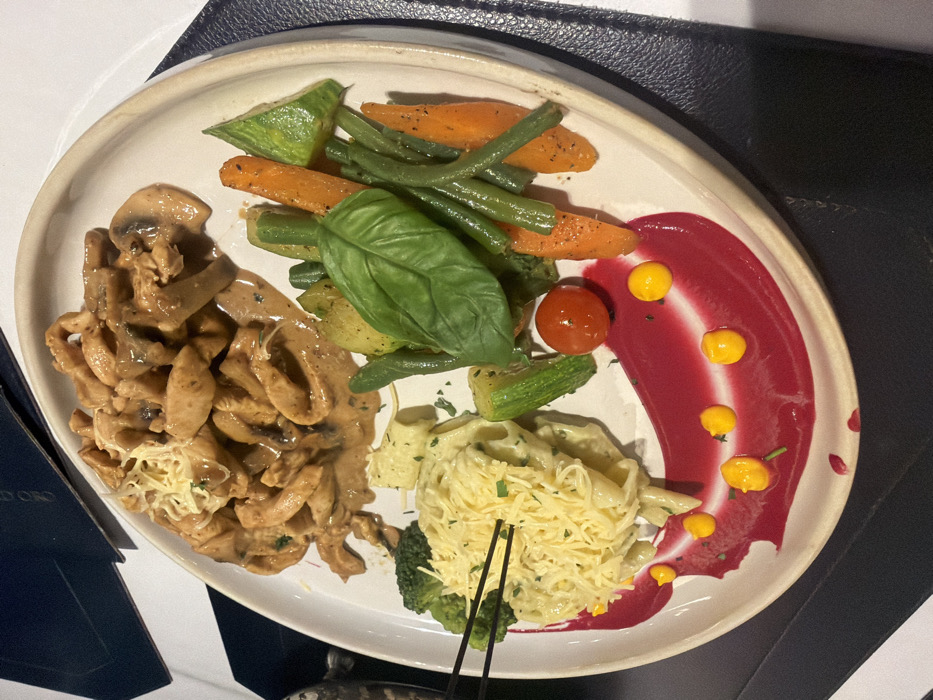 A white plate displays a medley of cuisine. Chicken Stroganoff sits beside pasta garnished with shredded cheese and broccoli. Roasted carrots, green beans, and zucchini are arranged with a fresh basil leaf and a single tomato. A vibrant magenta sauce, punctuated with yellow dollops, artfully decorates the plate's edge. The setting appears to be a restaurant.