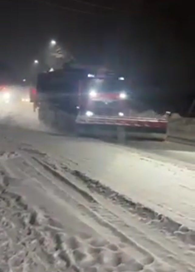 At night, a snowplow truck moves away from the viewer, clearing a snow-covered road
