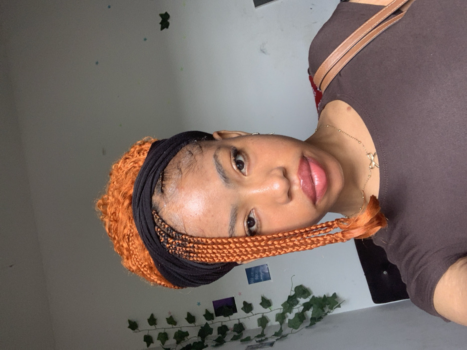 A young female is depicted in a chest-up portrait, facing the camera directly, within an interior setting in Lekki, Nigeria. The subject has orange-colored braided hair, partially covered by a black headscarf, with some braids extending over her left shoulder. She wears a dark brown, short-sleeved top and a gold-colored necklace with a small bow pendant. A brown strap, indicative of a shoulder bag, is visible on her right side. The background consists of a light-colored wall. On the left, a string of artificial green ivy hangs vertically, with two small, rectangular items (one purple, one blue) affixed below it. On the right, several small, dark butterfly-shaped decals are visible on the wall. A dark, indeterminate object, possibly furniture, is partially visible behind the subject on the lower left.