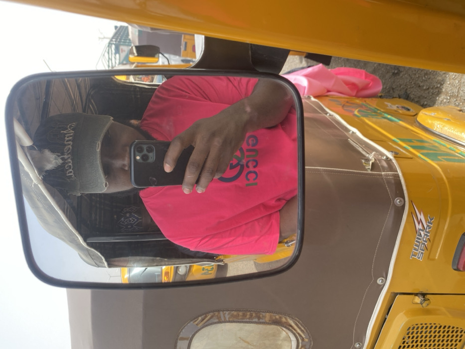 This image depicts a male individual taking a selfie in the rearview mirror of a yellow tricycle in Rijiyar Lemo, Nigeria