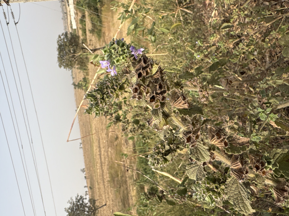 The image depicts a rural or semi-rural landscape in Keffi, Nigeria, under clear daytime conditions. The foreground is dominated by a robust, multi-stemmed plant with deeply veined, serrated, and somewhat hairy leaves, appearing in a dry or dormant state with brown and green coloration. Its stems feature numerous spiky, burr-like seed pods or bracts, with some small, light purple flowers visible on an upper cluster towards the right. The midground reveals an expansive area of dry, golden-brown vegetation, characteristic of fallow fields or a dry season, with scattered deciduous trees. In the background, the terrain continues with similar dry vegetation, more distant trees, and a hazy horizon, possibly indicating dust. A light-colored structure is faintly visible on the far right horizon. Overhead, multiple parallel power lines traverse the upper portion of the frame, supported by an unseen pole on the left and a visible utility pole on the far right. A broken or bent wooden pole or branch is suspended horizontally beneath these power lines in the central-left area. No human or animal subjects are visible, and no discernible actions or interactions are occurring. The lighting suggests direct sunlight from a high angle.