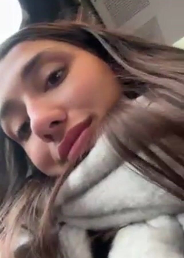 A young woman with long brown hair and light skin is looking at the camera in a selfie video. She is wearing a white and gray scarf and appears to be on a train or bus, given the window and interior visible in the background. Her eyes are initially closed, then she opens them slightly, looking tired. The lighting is soft, possibly from an overhead source.