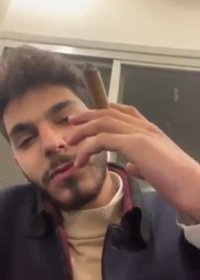 young man indoors, holding and smoking a cigar. He is looking down at the camera and takes a puff of the cigar. He is wearing a navy blue jacket with a gold emblem on it, and a cream-colored turtleneck sweater. There is a window in the background. The lighting is bright.
