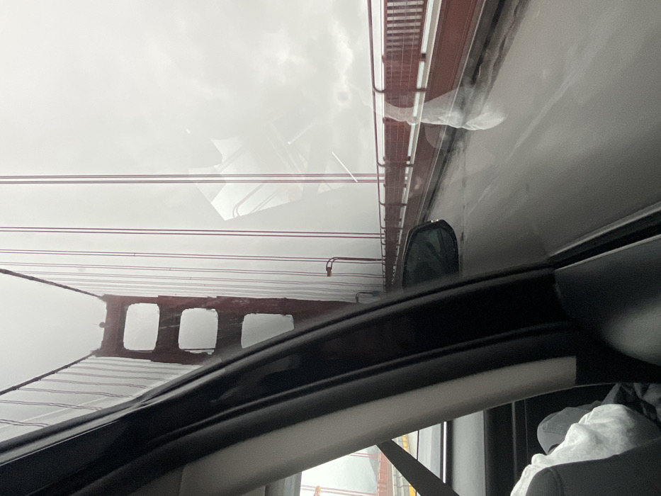 The image, taken from inside a vehicle, shows a blurred view of the Golden Gate Bridge on a foggy day