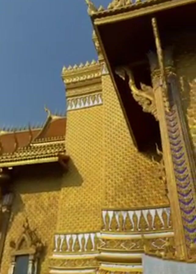 exterior of a golden temple under a clear, blue sky. The building is richly decorated with intricate gold carvings and moldings. Windows are framed with decorative elements. The roof is multi-tiered, with pointed decorative elements at the apex. In one section, a golden statue of Buddha is visible inside a small shrine. The video pans slowly to reveal more of the building's elaborate facade. The structure appears to be recently constructed or meticulously maintained.