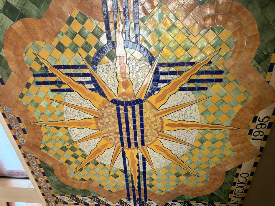 An overhead view reveals a mosaic art piece. The main focal point is a sun with 12 rays, colored in shades of yellow and orange, surrounded by a geometric design of green, yellow, and brown tiles. Blue vertical lines run through the sun's center. The mosaic also includes the text "NEW MEXICO" and the number "1995". The overall style is reminiscent of Southwestern art.