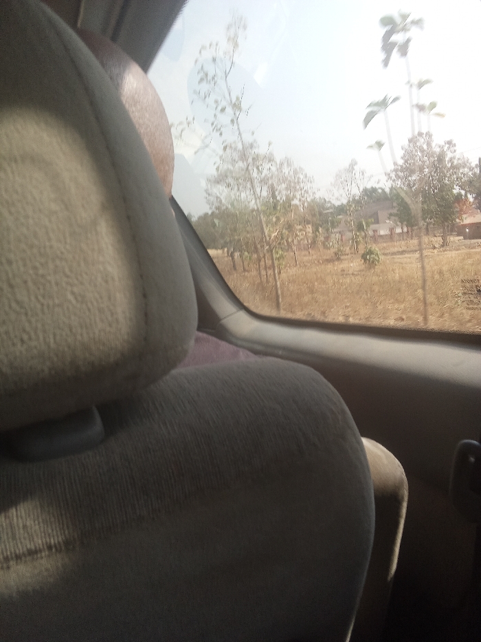 The image captures an outdoor scene in Akwanga, Nigeria, observed from inside a vehicle. The foreground is dominated by a light beige, textured fabric car seat headrest and the upper portion of its backrest, positioned to the left. A glimpse of a reddish fabric is visible behind it, along with the dark interior trim and window frame of the vehicle. Outside, a bright, hazy sky illuminates a dry, brown landscape. Deciduous trees with sparse foliage are scattered throughout, alongside some taller trees with broader leaves, possibly palm species, on the right. In the middle distance, a multi-story light-colored building and a smaller, darker structure are discernible.