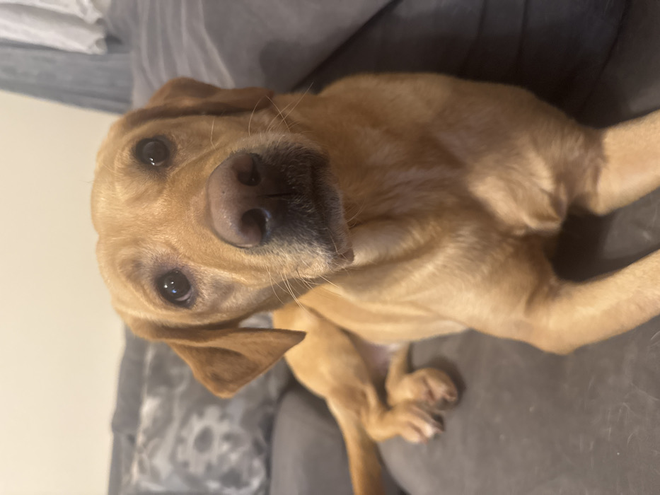 The scene depicts an indoor residential setting in Sofia, Bulgaria. A golden-brown Labrador Retriever dog is positioned centrally, lying on a grey fabric sofa. The dog's body is mostly visible from the chest up, with its front paws resting beneath its chest. Its head is directly facing the camera, exhibiting alert, dark eyes and a dark pinkish-brown nose. Whiskers are prominent around its muzzle. The dog's ears are floppy and hang naturally beside its head. The environment consists of the grey sofa, which has distinct cushions and appears to be upholstered in fabric. In the blurred background, additional sections of the grey sofa are visible, including a cushion with a faint patterned design to the left. A plain, light-colored wall occupies the upper background. A vertical grey textile element, possibly a curtain or drapery, is partially discernible in the upper right quadrant of the image. No human subjects are present.