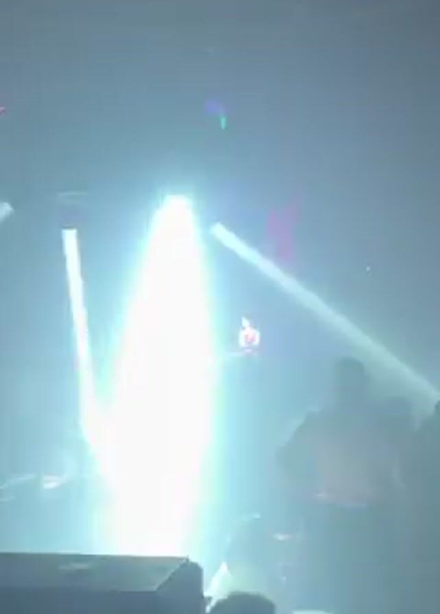The scene is a dimly lit nightclub or event space filled with people. A stage is visible with two figures illuminated by a bright white spotlight, suggesting they are performers. An overhead structure, possibly lighting equipment or a sound system, hangs from the ceiling. The overall atmosphere appears energetic with purple and pink lighting adding to the ambiance. The crowd is moving and seems to be enjoying the performance.