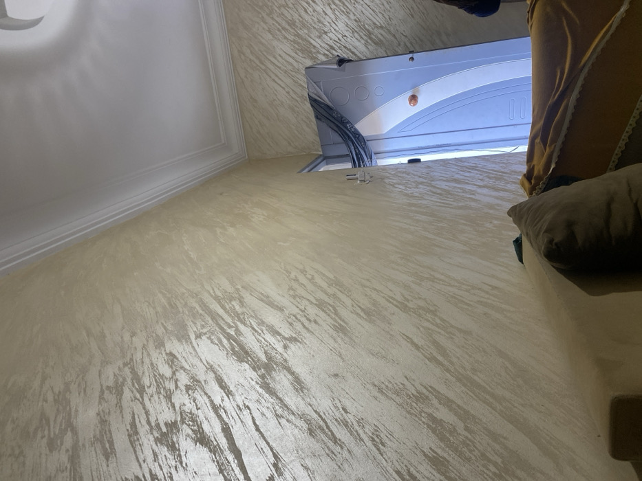 The image displays an interior room located in Al-Ghannada, Tunisia. The walls are finished with a textured, light beige or cream base featuring diagonal, metallic silver-gold brushstroke patterns. The white ceiling is adorned with ornate crown molding along its perimeter. A partially open doorway is visible on the right, revealing a light blue door detailed with white and darker grey geometric shapes, including circles and curved lines, and equipped with a spherical, possibly copper-toned door handle. A dark fabric is draped over the top left corner of the door frame. In the lower right foreground, a section of furniture is visible, including a dark brown cushion and an orange-yellow fabric with white decorative trim. No individuals are present in the scene, and no actions or interactions are depicted.
