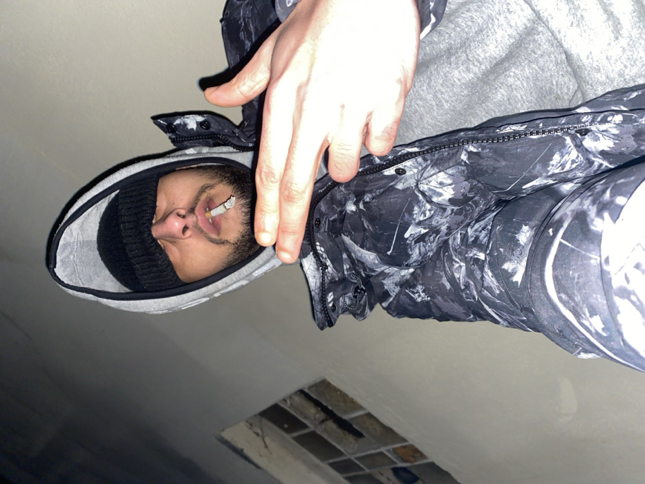 A person wearing a black beanie and a gray hoodie is facing down, with a lit cigarette in their mouth. They are wearing a patterned black and white jacket. A hand is hovering above the jacket. The background features a gray ceiling with a rectangular opening revealing brickwork. The image is rotated, creating an unusual perspective.