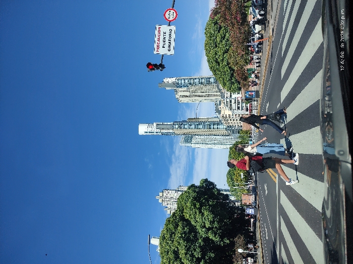 A sunny urban scene shows pedestrians crossing a zebra-striped crosswalk in front of tall buildings. A person in a red shirt leads, followed by a person in white, then another in black. The cityscape, visible under a clear blue sky, features high-rise architecture. Traffic lights and road signs are present. A partial view of a vehicle and the date '12 de feb de 2026' are captured on the right edge.