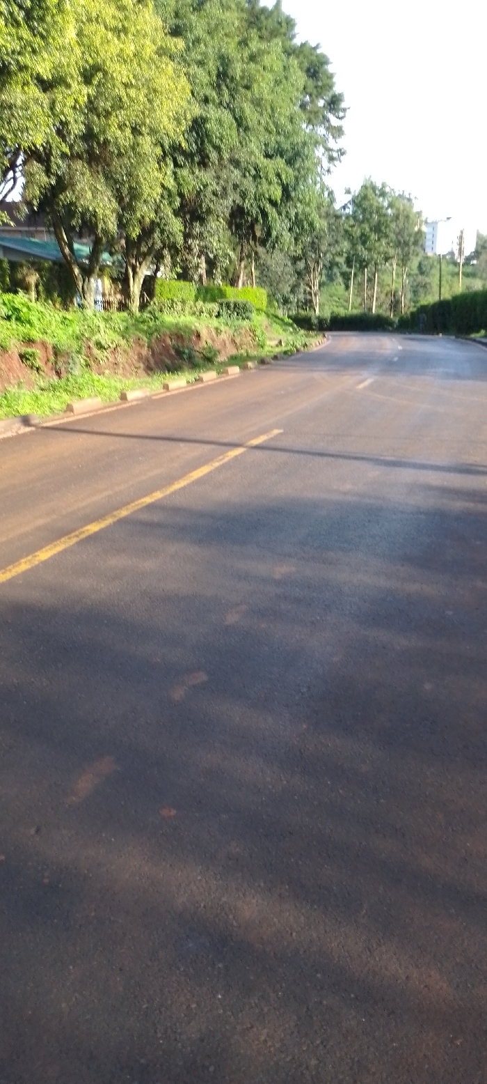 The image depicts an unoccupied two-lane asphalt road, curving gently to the right, in Ngong ward, Kenya