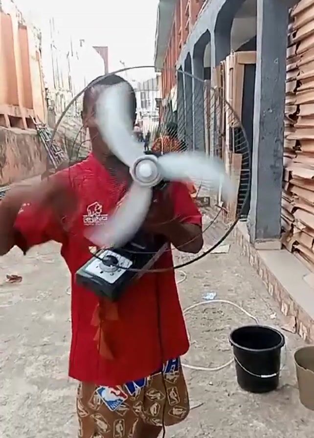 A man stands outside on a paved surface holding a running fan. He is wearing a red t-shirt and patterned shorts. The fan is round with a black wire cage around the blades and a black control box attached. He smiles and makes hand gestures as the fan blades spin. Behind him is a building with a walkway and stacks of cardboard boxes. There are two buckets near him, one black and one tan. In the background, other people and metal structures are visible.
