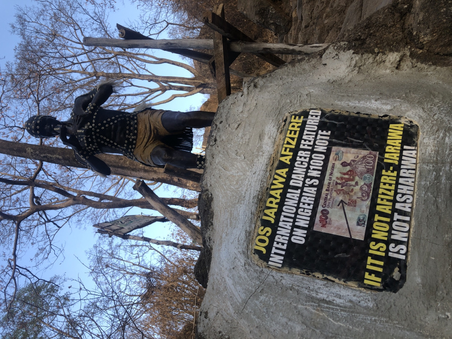 A statue of a dark-skinned figure in traditional attire stands atop a concrete pedestal. A plaque on the pedestal reads "JOS JARAWA AFIZERE INTERNATIONAL DANCER FEATURED ON NIGERIA'S N100 NOTE". An image of a 100 Nigerian Naira note is affixed to the plaque. Text below the image reads "IF IT IS NOT AFIZERE-JARAWA IS NOT ASHARWAL". Bare trees surround the statue, reaching towards a light blue sky.