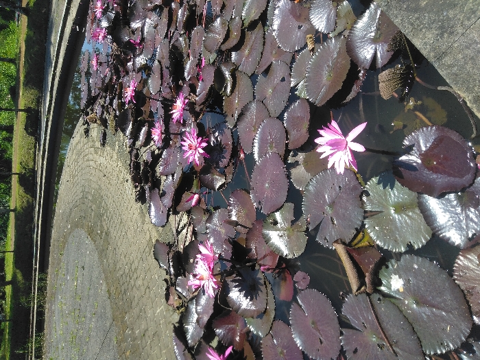 The image captures an outdoor scene in Phouviang-Gnai, Laos, under bright daylight conditions. The foreground and midground feature a pond densely populated with numerous dark green and purplish-tinged circular lily pads. Approximately ten vibrant pink water lily flowers are observed blooming, standing above the surface of the water, which exhibits reflective sun glare. Adjacent to the pond on the left, a curved section of a light gray paver pathway or plaza is visible, with minor vegetation growth present in cracks. The background consists of a gently rising green grassy bank, topped by a row of mature trees. No individuals, actions, or direct interactions are depicted within the frame.