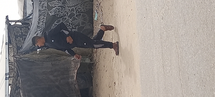 A young male, appearing to be in his late teens or early twenties with short dark hair, walks across a scene in Khan Yunis, Palestinian Territory