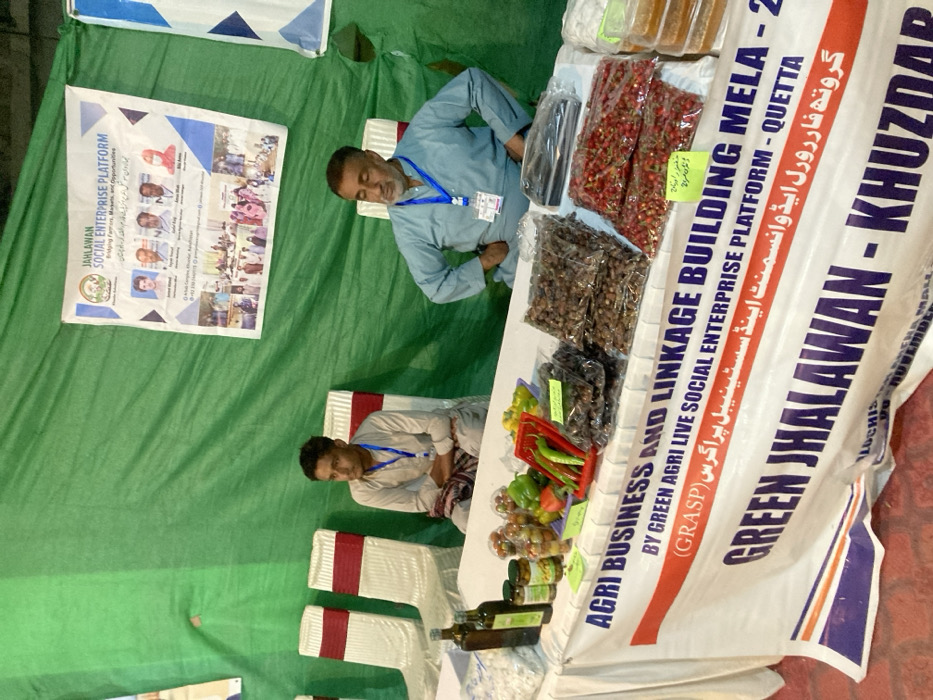 An indoor scene at an agricultural exhibition or market stall in Quetta City Tehsil, Balochistan, Pakistan. The background consists of a draped green fabric. Two adult males are seated behind a white-draped table displaying various agricultural products. The male on the left, appearing in his 20s or 30s, wears a light-colored shalwar kameez and a blue lanyard with an ID card. His arms are crossed, and he looks towards the left. The male on the right, appearing in his 40s or 50s, with a grey beard, wears a light blue shalwar kameez and a blue lanyard with an ID card. His hands are placed on his hips, and he looks to the right. Both are positioned behind the table with chairs covered in white fabric with red accents. The table is laden with products. From left to right: two dark glass bottles, three smaller glass jars with green labels (likely containing preserved goods), a clear plastic container of red cherry tomatoes, a red plastic tray holding green bell peppers, yellow bell peppers, and long green chili peppers. Multiple clear plastic bags filled with dark brown dried fruits (possibly dates) and several clear plastic bags filled with small red fruits or berries are also on display. Further to the right, a stack of clear plastic containers likely holds honey or a similar product. A large white banner draped across the front of the table reads "AGRI BUSINESS AND LINKAGE BUILDING MELA - QUETTA" and "BY GREEN AGRI LIVE SOCIAL ENTERPRISE PLATFORM - (GRASP) گرین ایگری لایف سوشیل انٹرپرائز پلیٹفارم". Below this, "GREEN JHALAWAN - KHUZDAR" and partially visible text "BALOCHISTAN, QUETTA MALL" and "20 - 22 NOVEMBER". A smaller white banner affixed to the green backdrop identifies the event as "JHALAWAN SOCIAL ENTERPRISE PLATFORM - Bridging Farmers, Markets, and Opportunities," featuring multiple photographs of individuals and groups.