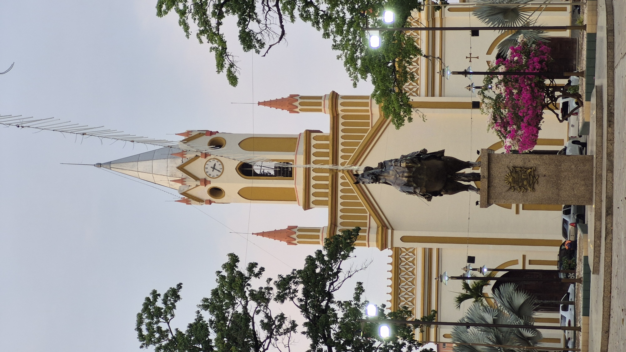 The image depicts a public plaza in Tinaquillo, Venezuela, featuring an equestrian statue in the foreground centered against a church. The statue, cast in a dark metal, portrays a figure on a rearing horse, positioned on a tiered, light-colored stone pedestal. An emblem is visible on the front of the pedestal. Behind the statue, the church exhibits a cream or off-white facade with yellow-gold architectural trim and reddish-orange accents on its spires. The central feature is a prominent clock tower with a silvery conical roof topped by a finial. Below the cone, an octagonal section houses a circular clock face, indicating approximately 1:45. An open belfry or arched window is situated beneath the clock. Two smaller, pointed spires with reddish-orange tops flank the central tower at a lower elevation. Architectural details include repeating vertical elements, horizontal bands, and a visible cross on the far right section of the church facade. The plaza environment includes several streetlights with bright, white LED fixtures. Two tall trees with green foliage frame the scene on the left and right, partially obscuring the upper portions of the church and sky. To the right of the statue, a large bush or small tree with vibrant pink and white flowers is prominent. On the left, several fan palm trees are visible. The ground in the immediate foreground is paved. A string of vertical white elements, possibly decorative lights, extends diagonally from the upper right toward the clock tower. The sky is uniformly light grey and overcast. Several parked vehicles are partially visible behind the plaza elements in the mid-ground.