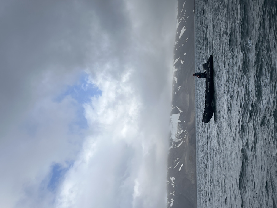 A dramatic landscape with a dark boat on choppy water. A single person sits in the boat, positioned near the shoreline. Mountains rise in the background, partially obscured by low-lying clouds. Above, a mostly overcast sky reveals small patches of blue. The rugged mountain terrain is touched with spots of snow. The image is oriented sideways, with the horizon appearing vertical.