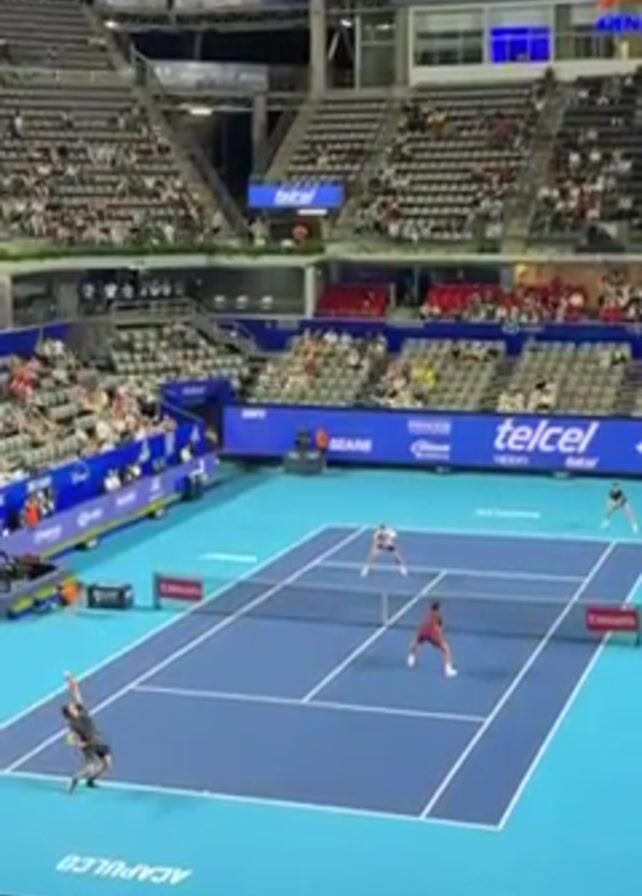 A high-angle, eye-level shot of a tennis match taking place in a stadium at night. The court is primarily blue, with white lines indicating the boundaries. Two teams, each with two players, are engaged in a rally. On one side, the players are wearing black and white; on the other, one player is in a maroon outfit, while the other wears white. Both sides swing at the ball with their tennis rackets. The stadium is packed with spectators in the stands, with several sponsor logos, including "telcel," prominently displayed around the court and in the stands. The atmosphere seems intense and competitive.