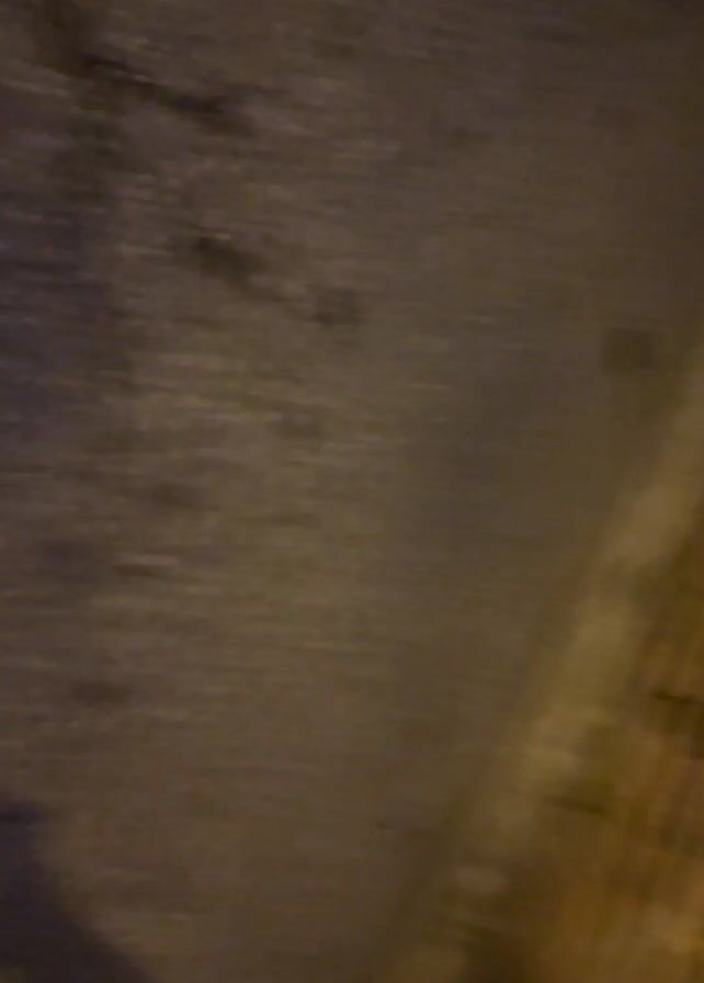 person walking along a street with brick walls to one side. The person is wearing dark pants and light-colored sneakers. The camera angle is low, focusing on the ground and the brick walls. The lighting is dim, suggesting it is nighttime. The video is shaky, likely because the person is filming while walking. The walls have some graffiti on them. At one point, a sign becomes visible on the wall.