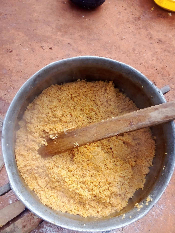 - "A large, circular aluminum pot, exhibiting external discoloration consistent with heat exposure, is filled with reddish-orange Jollof rice, from which steam is visibly rising" by FM-I9ASJ2, licensed under CC BY 4.0