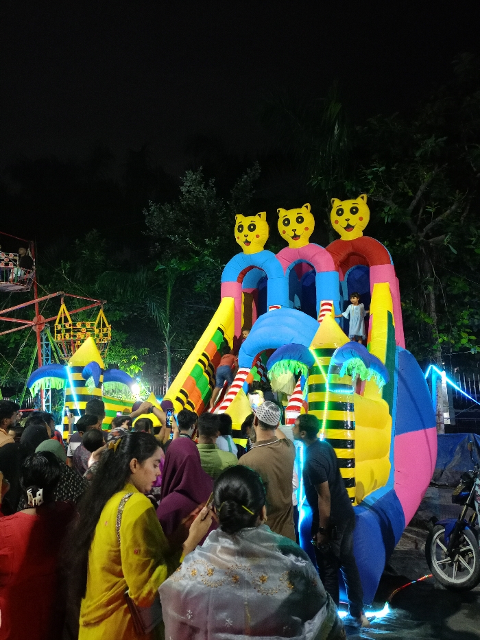 This nighttime image depicts a bustling outdoor recreational area or temporary fairground in Dhaka, Bangladesh. The central focus is a large, brightly illuminated inflatable play structure featuring three yellow, stylized cat heads at its apex, along with multi-colored slides and climbing areas. A dense crowd of individuals, primarily adults and children, surrounds the structure. Multiple children are observed utilizing the inflatable, with one child in a light-colored top positioned at the top of a slide and another in a red top ascending. To the left, a segment of a red Ferris wheel, occupied by at least two individuals, is visible. Adjacent to it, a yellow and blue inflatable component is present. Blue string lights provide ambient illumination throughout the background, where trees are discernible against the dark night sky. A dark-colored motorcycle is partially visible on the far right. The scene is lit by the attractions' internal and external illumination.