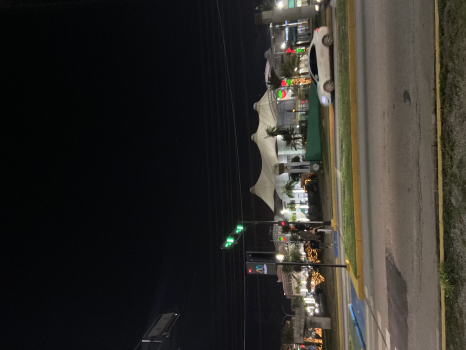 At night, a street view features a brightly illuminated shopping complex with distinctive, white, umbrella-shaped canopies. Decorated palm trees and Christmas lights add to the festive ambiance. A traffic signal shows green, indicating that traffic can proceed. A car is parked near the sidewalk. The street is defined by a yellow curb, and a narrow grass strip separates it from a wider, overgrown area. Overhead power lines are visible against the dark sky.